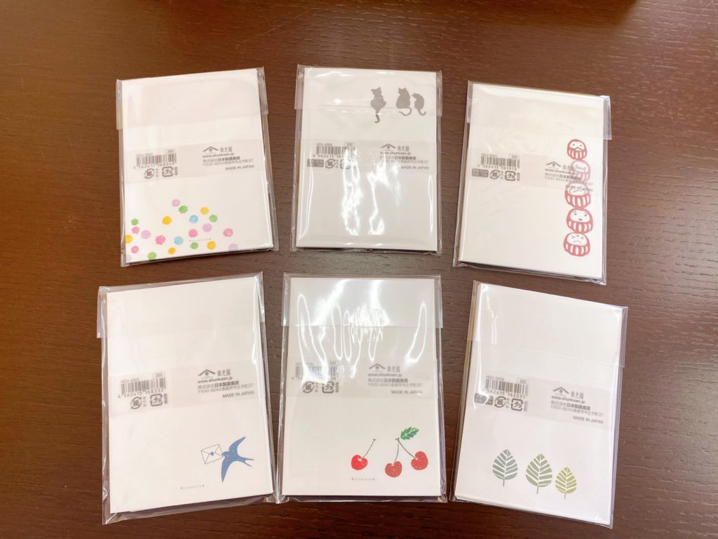 新入荷「ひとふで箋」 2020.05.28Blog Tweet Share こんにちは★今日は新入荷アイテムをご紹介します!春光園 ひとふで箋ちょっとしたお手紙を書くときにピッタリなミニレターです。版画風の優しいイラストがとっても可愛いですね! 封筒にも便箋と同じ柄のイラストが描かれています! ●商品ラインナップ柄:(左上から)こんぺいとう、ネコ、だるま、原稿用紙、さくらんぼ、リーフ便箋:30枚入封筒:5枚入価格:300円(税別) プレゼントやお礼、借りたものを返す時など一言でもミニレターが入っていると嬉しいですよね★小さな気持ちでもレターで届けてみてくださいね! ぶんぐのゆにおんOPEN:月~金 10:00~18:00広島市安佐北区亀崎3-5-12【バス】高陽A団地行き「西山公園前」下車 徒歩約1分【電車】JR芸備線「下深川駅」下車 徒歩約10分 最近の投稿 初心者におすすめ!ガラスペンの紹介✨ さらに使いやすく!マッキーノック 気持ちも心機一転!新3色ボールペン デイサービスすずはり様の作品のご紹介 いつもと一味違う野帳「測量野帳60th限定」 Tweet Share 投稿者: union Blog コメント: 0 かどに貼って忘れない「かどふせん」 マスクがツラくなる時期に「ハンズフリーファン」 コメント ( 0 ) トラックバック ( 0 ) この記事へのコメントはありません。 この記事へのトラックバックはありません。 トラックバック URL 返信をキャンセルする。 名前 ( 必須 ) E-MAIL ( 必須 ) ※ 公開されません URL Δ 関連記事一覧 【BELL’S】キーホルダー★ マスクがツラくなる時期に「ハンズフリーファン」 文具総選挙2021 接触感染予防に「ゴム手袋」 卒業記念品★特注ノート 日本文具大賞 ドクターグリップ【ニコラコラボ】 SNS更新しています! matimatiシリーズ